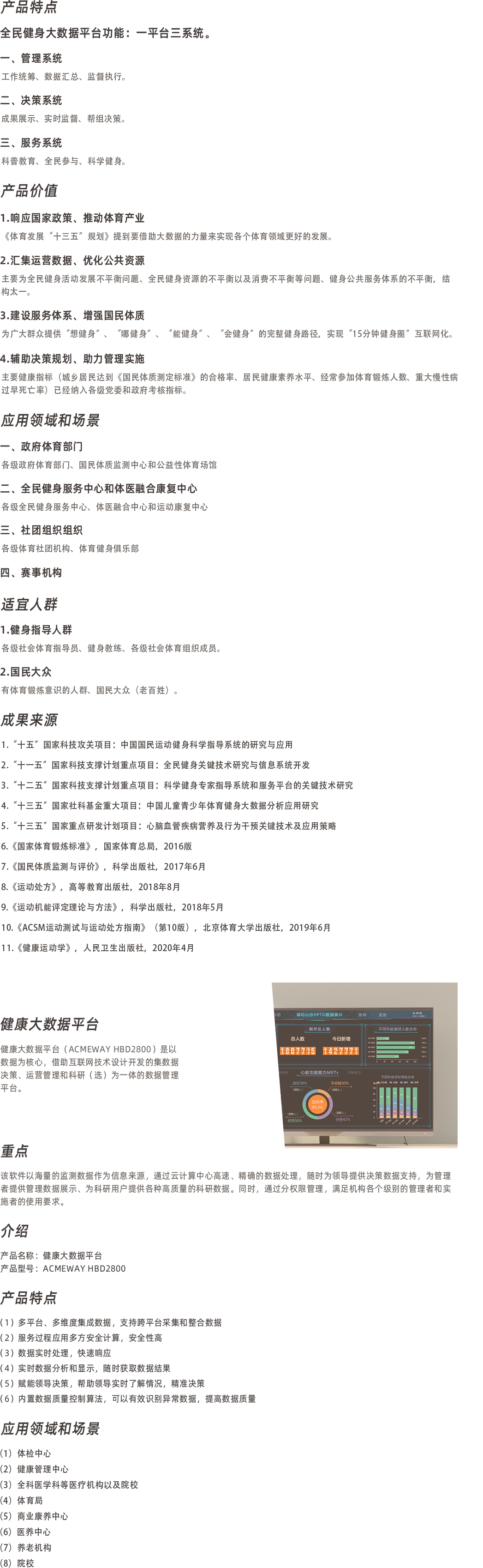 全民健身大数据平台(ACMEWAY NBD1800)充分利用群众体育部门及其他体育部门,以及政府部门各类资源优势,如科学健身指导、国民体质监测、全民健身状况调查、国家体育锻炼标准、低开免开体育场馆、社会体育指导员培训和管理、体育社团组织管理、公益性活动与赛事、政策法规发布等等,共同构建全民健身大数据平台,满足不同主体对全民健身的不同需求,实现决策分析、统筹管理、全民服务的需求,以此打通决策、管理、服务、信息、资源的壁垒,推动大众运动健身,增强科学指导意识,吸引大众积极主动参与体育锻炼,促进大众养成良好的锻炼习惯,从而提高国民体质健康水平